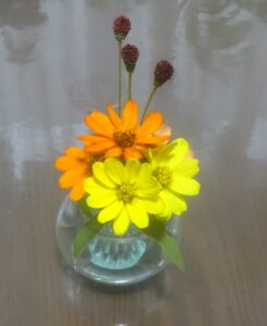 家内が、庭に咲いているジニアとワレモコウを